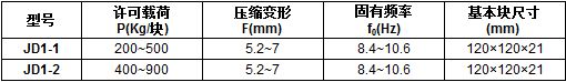 JD1型減振墊基本塊體尺寸120×120×21(mm),豎向荷載范圍P = 200~900kg/塊,固有頻率f0 = 8.4~10.6Hz。