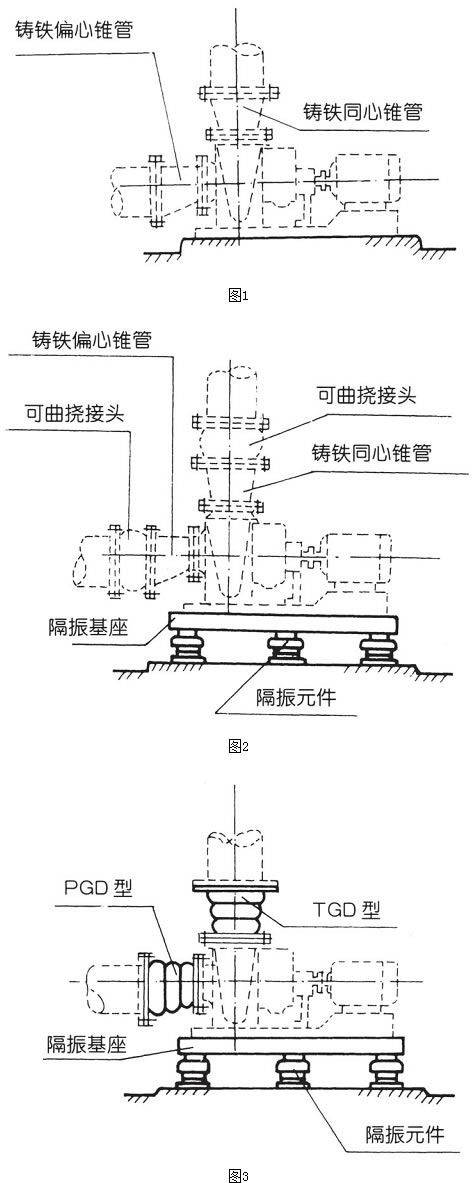 • 圖1:不隔振安裝 圖2:傳統(tǒng)的隔振安裝 圖3:改進的隔振安裝